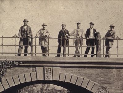 Image: Green, left, atop the Willowdell Arch in Central Park, 1862. Next to him is the the creative team that worked under the Central Park Commission, including Frederick Law Olmsted, right, and Calvert Vaux, left of center.