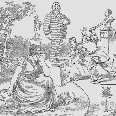 Image: Prospect Park after consolidation, as imagined by The Eagle: Miss Brooklyn weeps near a statue of Boss Tweed while an innocent citizen is beaten by a policeman