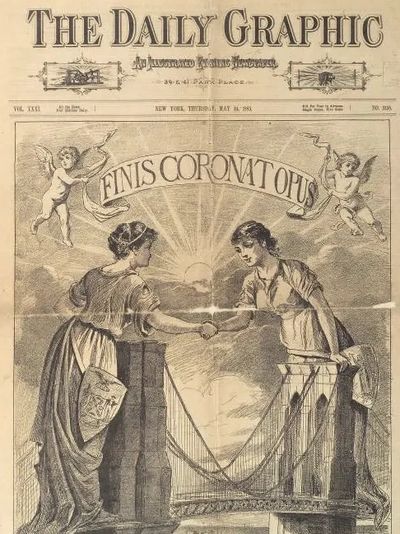 Image: The caption of this illustration which was published when the Brooklyn Bridge opened is "A union of hearts and a union of hands."